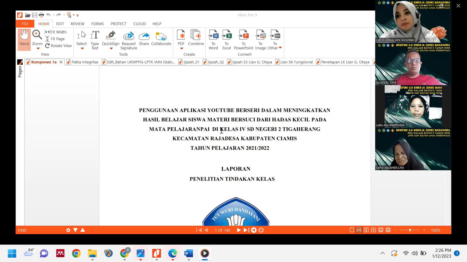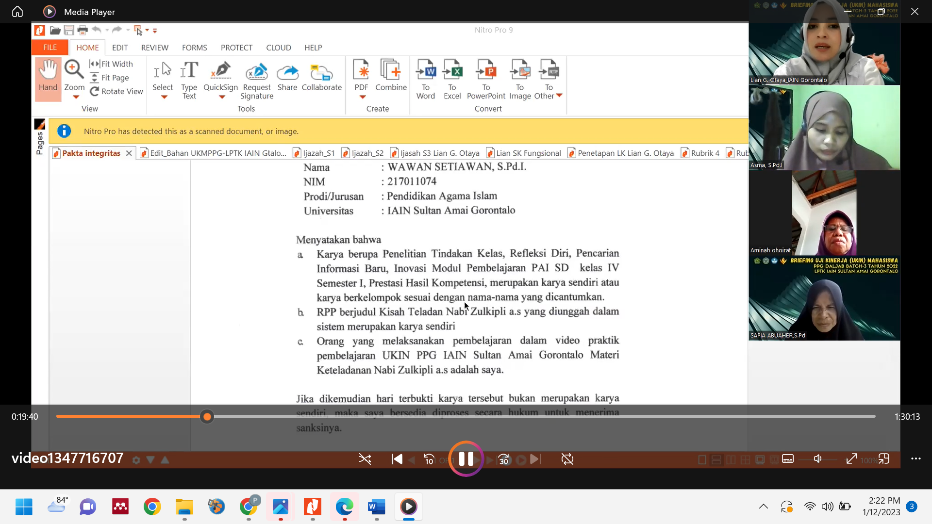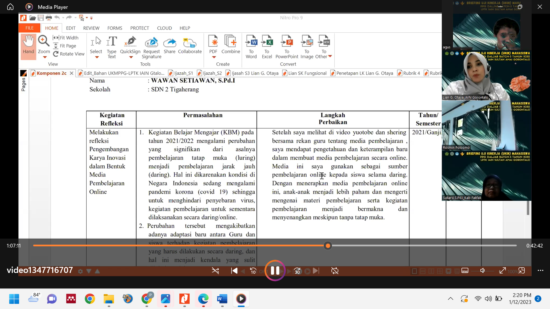 Kegiatan dilanjutkan dengan penyampaian secara teknis terkait Mekanisme Uji Kompetensi Mahasiswa Pendidikan Profesi Guru (UKMPPG) oleh Dr. Lian G. Otaya, M.Pd sebagai Kaprodi PPG LPTK IAIN Sultan Amai Gorontalo. Penyampaian diawali dengan penjelasan UKMPPG yang terdiri dari Uji Kinerja (UKin) dan Uji Pengetahuan (UP). Untuk UKin terdiri dari Portofolio dan Praktik Pembelajaran. Pada penilaian portofolio merupakan kegiatan penilaian dalam PPG terkait dengan capaian pembelajaran ketujuh (CP 7) dalam program PPG yaitu guru mampu mengembangkan diri secara berkelanjutan sebagai guru profesional yang dibuktikan dengan kegiatan: 1) Penelitian dan publikasi; 2) Refleksi diri; 3) Pencarian informasi baru; dan 4) Karya Inovasi; 5) Prestasi melalui kompetisi; 6) Pengabdian kepada masyarakat. Dari keenam komponen terdapat komponen utama berupa : penelitian dan publikasi, refleksi diri, pencarian informasi baru, inovasi dan komponen pendukung berupa prestasi melalui kompetensi dan pengabdian masyarakat. Sementara Uji Praktik Pembelajaran berupa video praktik pembelajaran dilengkapi dengan perangkat pembelajaran secara lengkap mulai dari RPP, Bahan Ajar, Lembar Kerja Peserta Didik (LKPD), Media dan Instrumen Penilaian.